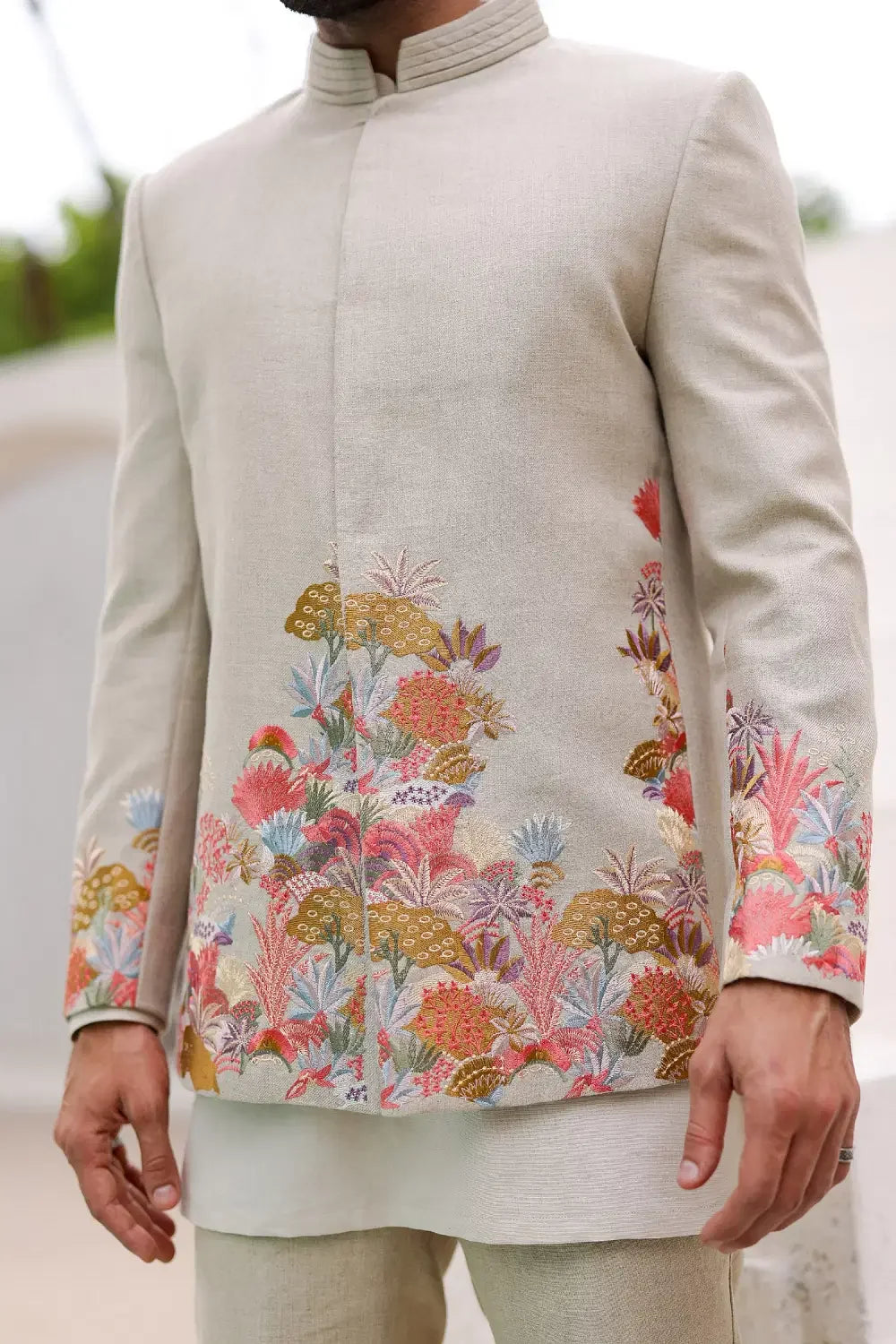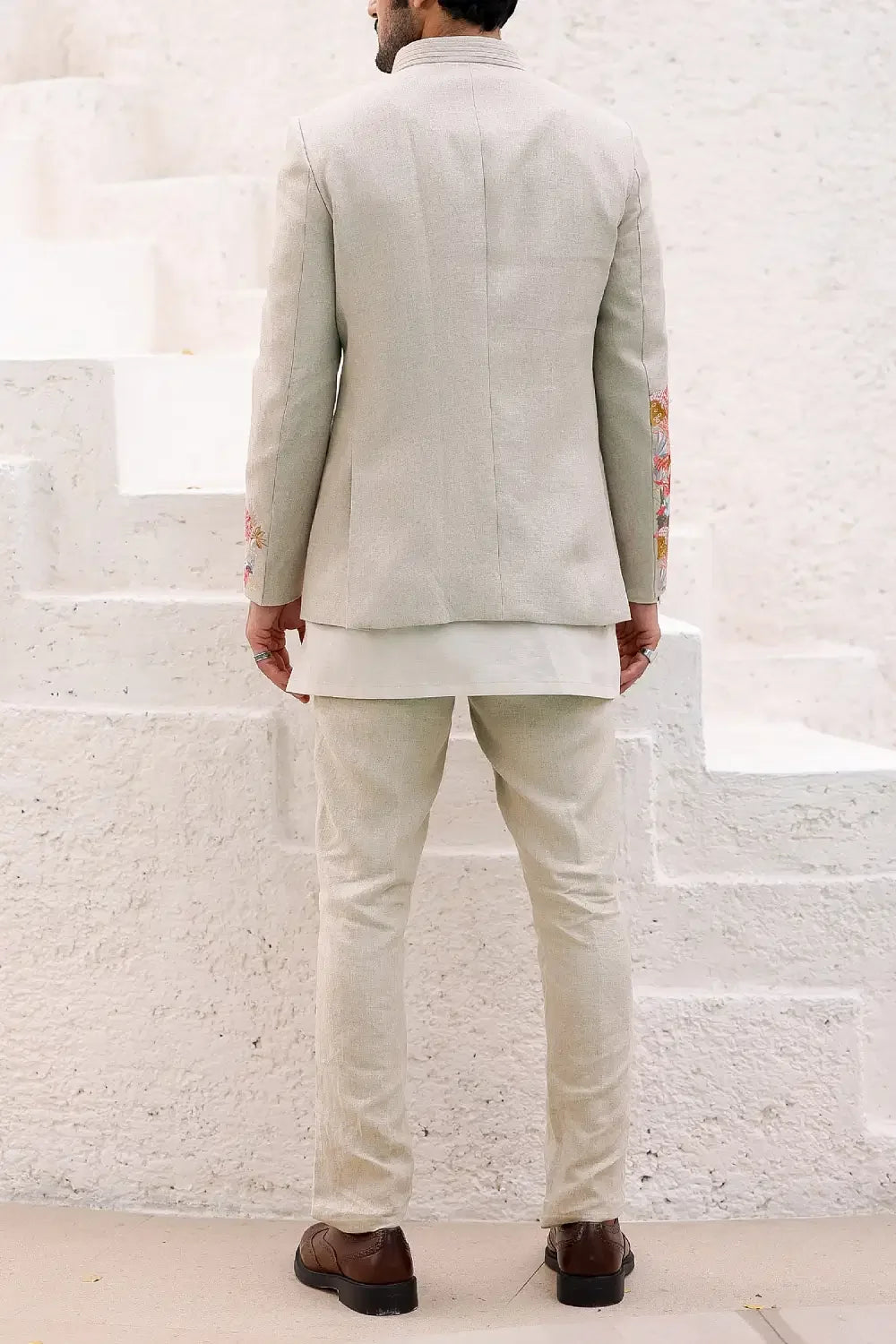 Rent this opulent bandhgala woven in pure linen with resham embroidery detailing in floral placement patterns. It is paired with a short kurta and trousers. Style the look with embroidered juttis for an impeccable appearance.