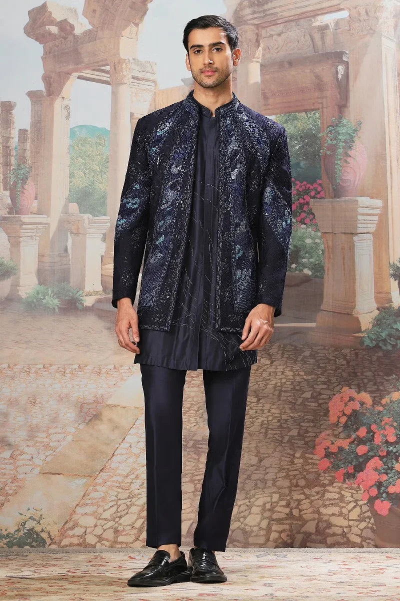 Rent this Indo-Western fusion look with this front-open chanderi silk jacket enriched with intricate applique work, thread, resham, cutdana, bead, French knot, sequin and tone-on-tone embroidery, pairing it with a cutdana-embroidered cotton silk kurta and pants. Style the look with embellished mules for a striking impression.