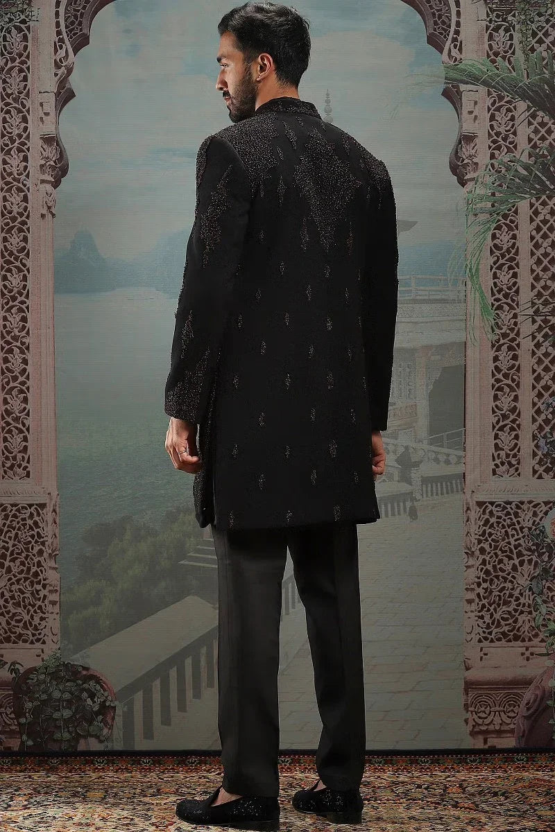 Rent this celebratory Indo-Western open-style jacket crafted in raw silk, adorned with intricate hand embroidery featuring French knots, beads, pearls and cutdana details, teamed with a matching kurta and pants. Style the look with sequin embroidered juttis for an elevated festive gathering.