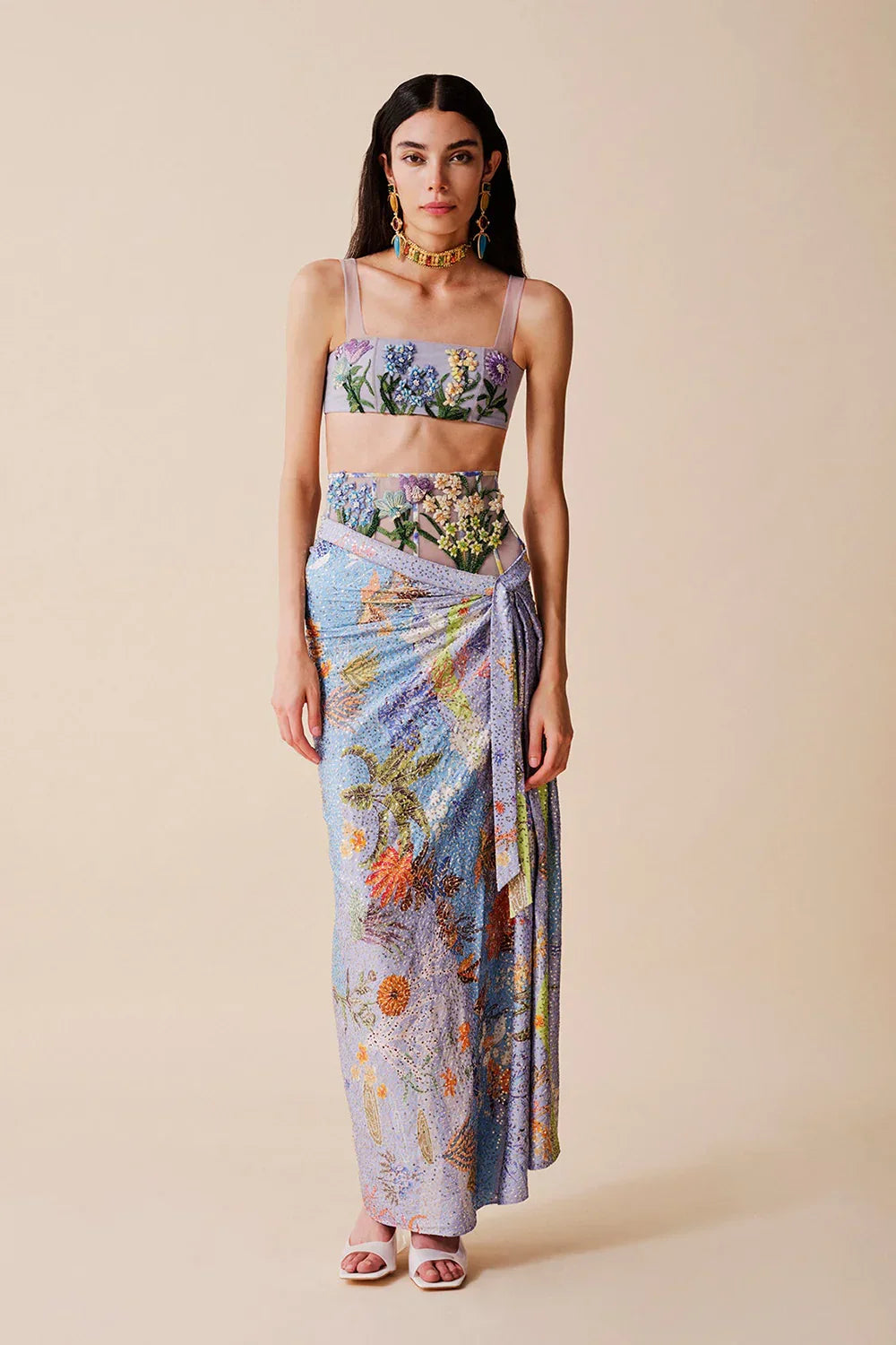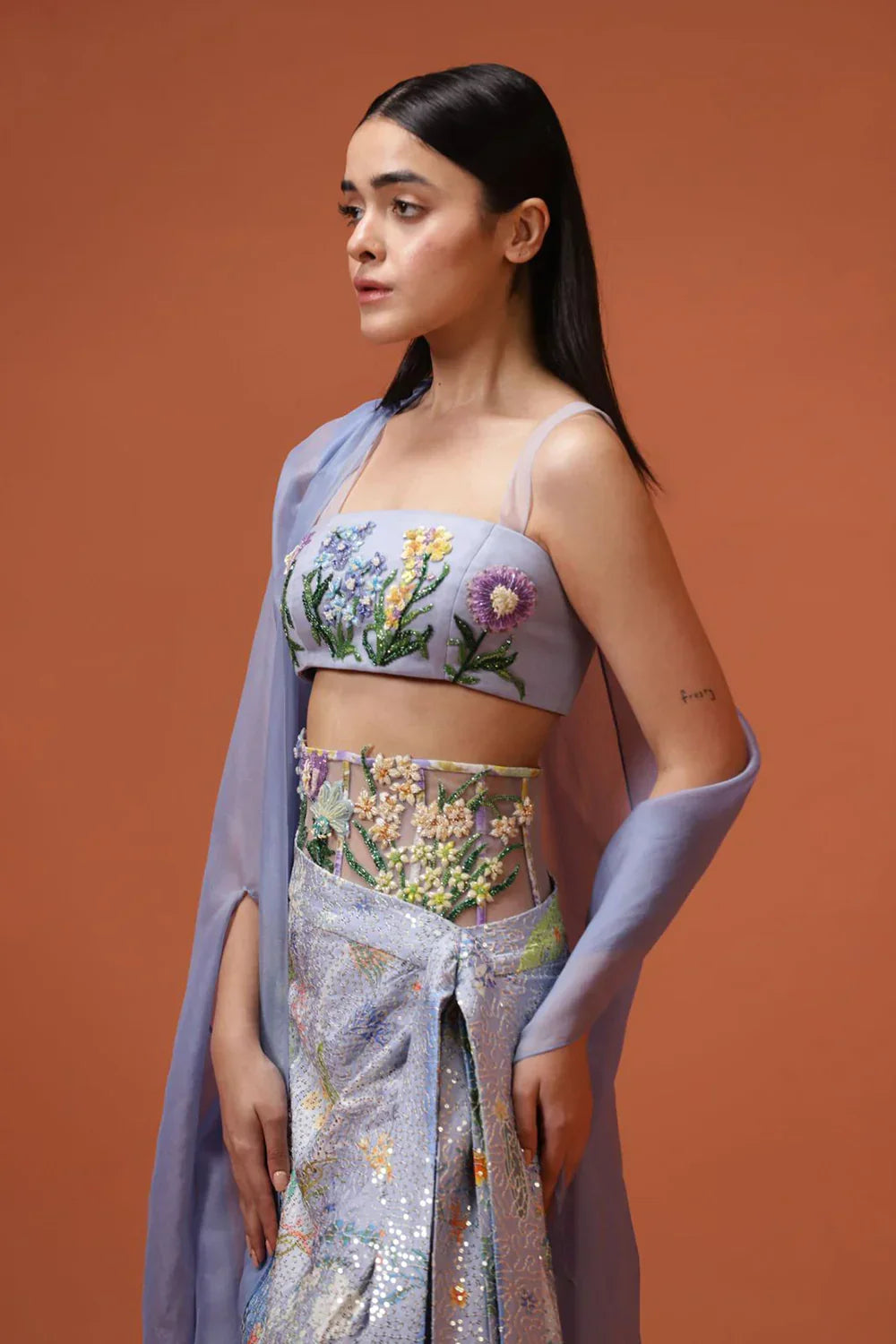 A corset-belt, adorned with exquisite handcrafted 3-D flowers, enhanced by captivating 3-D embellishments. This sartorial masterpiece is paired with a draped skirt that boasts a delightful mix of prints and intricate embroidery, adorned with shimmering sequins.