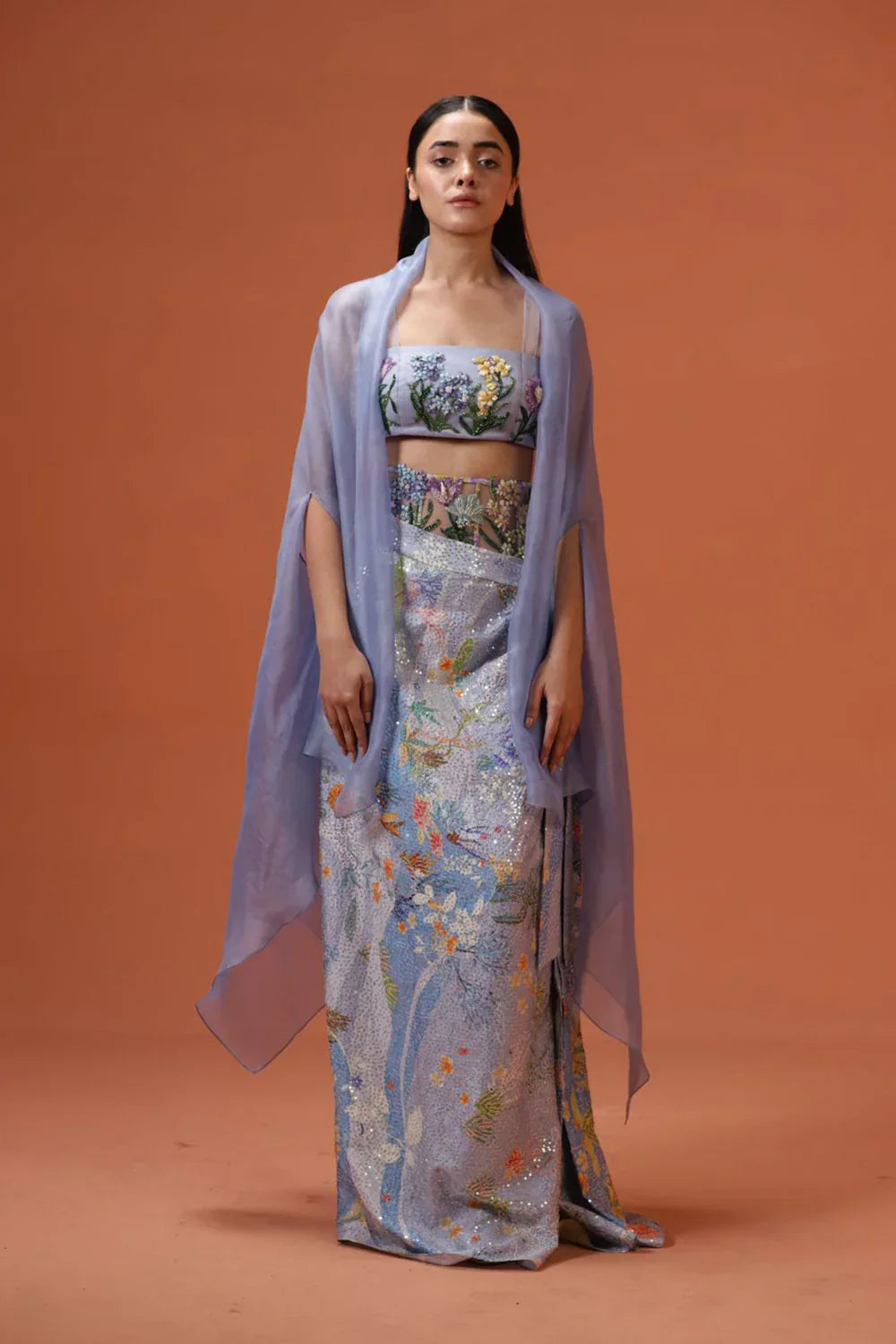 Meticulously designed on a lustrous silk canvas, this ensemble is perfectly complemented by a blouse featuring delicate floral 3-D accents, creating a harmonious balance of artistry and style paired with an organza tailored jacket, paying homage to the opulent drapery of the subcontinent. Our fusion-wear draped skirt celebrates the seamless fusion of tradition and contemporary fashion.