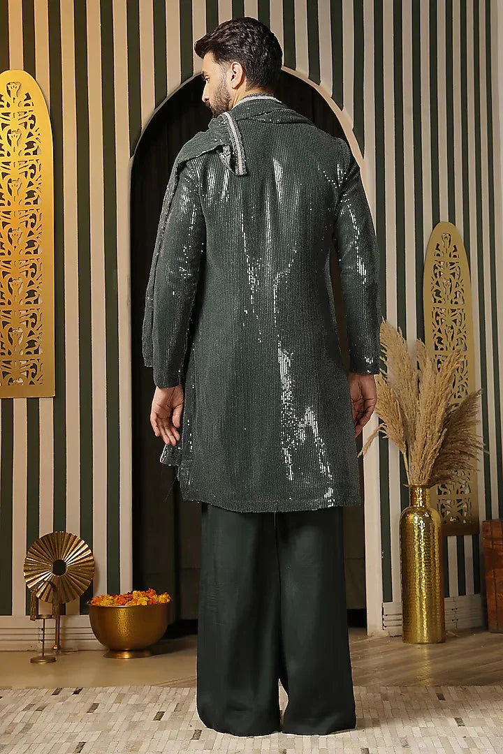 Featuring a deep forest green kurta in sequins georgette base with embellishments and embroidery. It is paired with trousers and a stole. Perfect wear for a festive occasion, sangeet or engagement ceremony, exuding traditional charm and elegance.