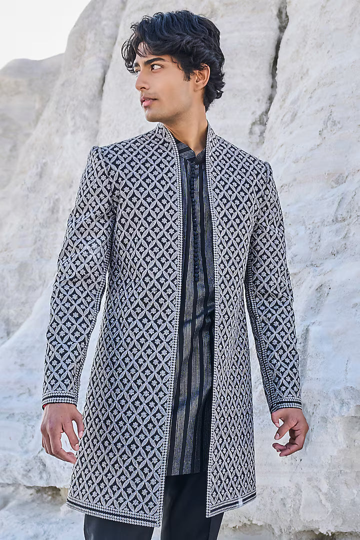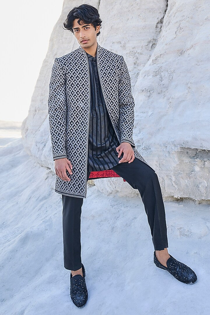 Featuring a black indowestern in raw silk base with silver zari embroidery. It is paired with a matching cotton silk kurta having silver stitch and straight pants.
